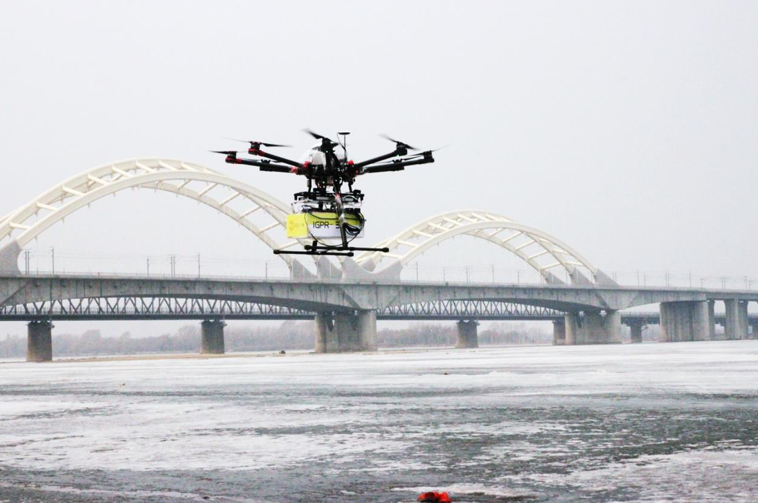 大連中睿科技發展有限公司歷時一年研發的IGPR-30無人機飛航測冰雷達,2016年初在松花江哈爾濱江段試驗成功,獲得了清晰準確的連續冰層雷達圖像。飛航測冰現場,系統飛行姿態穩定,雷達探測成像清晰,操控靈敏,可以10-15m/s速度快速連續施測,可實時獲取高精度的河流冰層連續厚度數據。IGPR-30無人機飛航測冰雷達集成了RTK精確定位系統,可準確測量記錄飛航測線軌跡,并與GIS地圖融合。IGPR-30無人機飛航測冰雷達是河流冰情觀測的創新性技術設備,為河流冰情快速精準測量和河流凌汛應急探測提供了先進的高效率的技術手段。